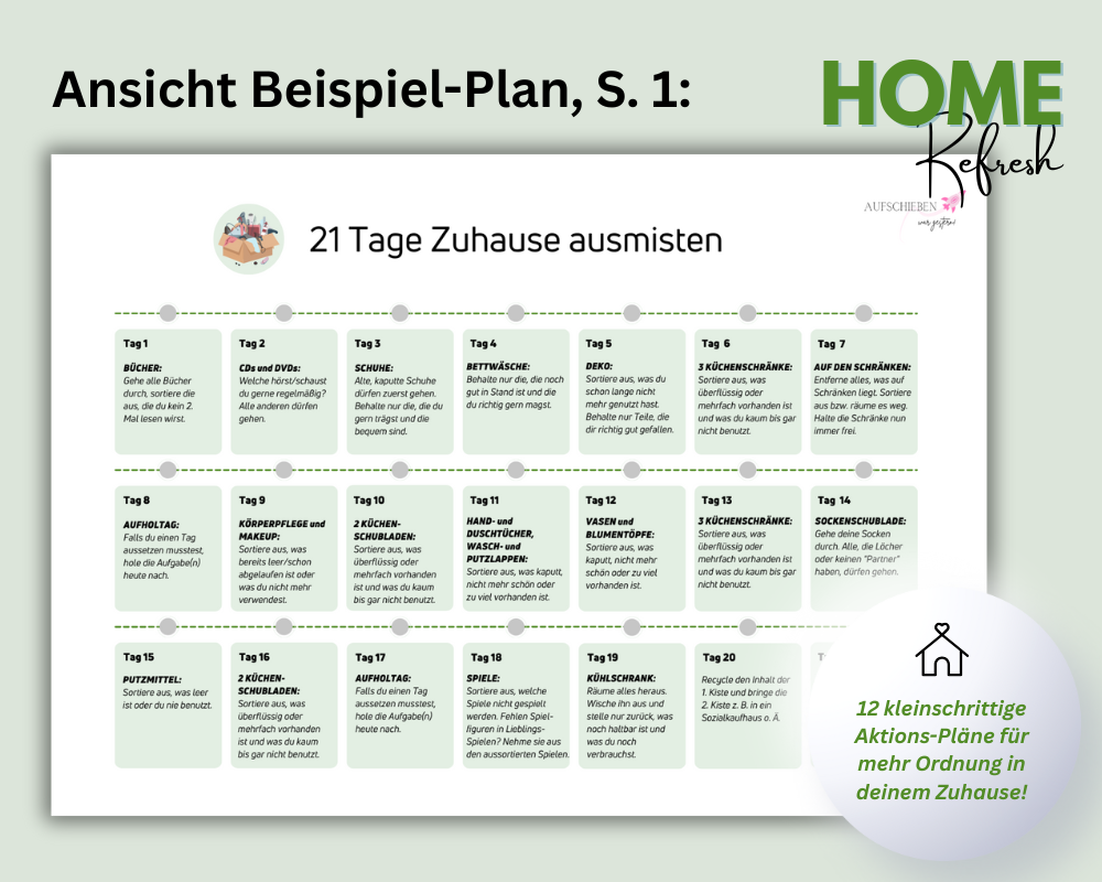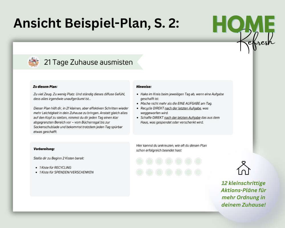 Das Set enthält 12 durchdachte 7- bis 28-Tage-Pläne, die dir helfen, dein Zuhause nach und nach zu verschlanken, zu vereinfachen und nachhaltig zu organisieren – ohne Überforderung, aber mit maximalem Effekt. Ob Krimskrams, Kleiderschrank, Küche, Papierkram oder Routinen: Jeder Plan widmet sich einem klaren Bereich und bringt dich durch alltagstaugliche Aufgaben sofort ins Tun.